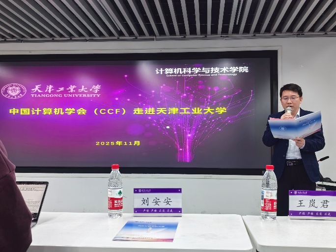2025年11月28日下午,学术氛围浓厚的“CCF天津走进天津工业大学”主题活动在天津工业大学天软云端报告厅成功举办。本次学术盛会由中国计算机学会(CCF)发起主办,CCF天津分部携手天津工业大学计算机科学与技术学院共同承办。会议邀请到山东大学丛润民教授、天津大学讲席教授刘安安、中科院计算所研究员王瑞平以及南开大学计算机学院教授孙国磊等多位人工智能前沿领域的重量级学者莅临现场,分享最新科研成果。本次活动由天津工业大学计算机科学与技术学院常务副院长杨勇教授担任执行主席,吸引了百余名学院教师、博士及硕士研究生到场聆听,现场座无虚席。天津工业大学计算机科学与技术学副院长郭永峰教授和刘那与博士共同主持本次活动。