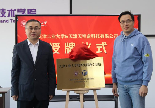 签约仪式前,天空盒华北地区负责人赫士聪介绍了该公司近几年在游戏研发、人才培养、校企合作等方面的成果和情况,副院长苏卫星阐述了双方在元宇宙和游戏开发方向的项目合作、课程建设、学生实习实践、学科竞赛等领域合作目标。在与会嘉宾的共同见证下,双方代表正式签署了校企合作框架协议。随后,副校长林立刚向天空盒公司授予了“天津工业大学实践教学基地”牌匾。