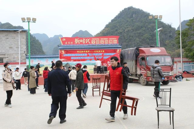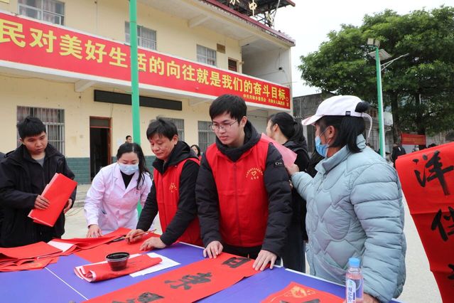 寒假期间,计算机2502班陆以烁在家乡大化瑶族自治县新时代文明实践中心当起了志愿者。每天清晨,他第一个到场布置活动区域,搬桌椅、摆展架,忙得满头是汗;活动中,他穿梭在人群中耐心维持秩序,引导乡亲有序参与;最细致的是整理写好的春联——他一幅幅轻轻抚平、分类码放,生怕折坏了哪个字。“这娃心细得很!”一位阿婆接过春联直夸他。从晨光到日暮,他身上的红马甲成了瑶乡冬日最暖的颜色。