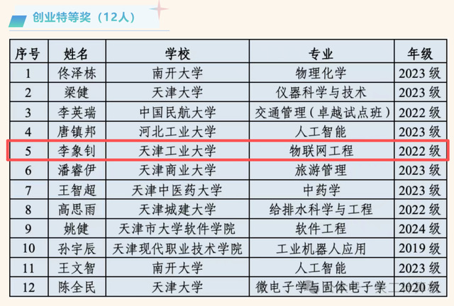 近日,2025年天津市大学生创新创业奖学金评选结果正式揭晓,我院物联网工程专业2022级本科生李象钊凭借突出的创新创业实绩,成功斩获创业特等奖,充分展现了天工学子敢闯敢创、实干笃行的青春风采,彰显了学院创新创业人才培养的扎实成效。